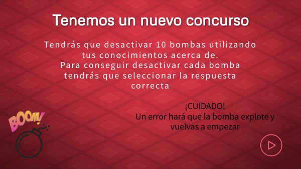Tendrás que desactivar 10 bombas utilizando tus conocimientos acerca de personajes públicos de televisión. Para conseguir desactivar cada bomba tendrás que seleccionar la respuesta correcta