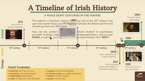 The violence in Northern Ireland in the last half of the 20th century may seem like recent history, but the hostilites between the British and the Irish actually go back over 850 years! How did the conflict begin? Why is Ireland divided? Is reunification possible? To better understand Ireland's complicated history, click on each IMAGE, or each , as it appears. When you have finished, click "NEXT".
