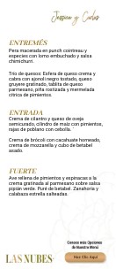 Crema de cilantro y queso de oveja semicurado, cilindro de maíz con pimientos, rajas de poblano con cebolla. ´ Crema de brócoli con cacahuate horneado, crema de mozzarella y cubo de betabel asado.
