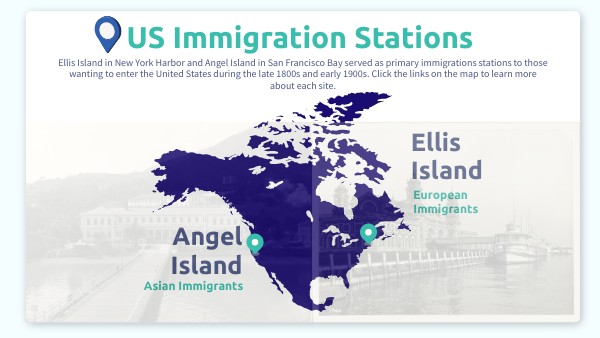 Ellis Island in New York Harbor and Angel Island in San Francisco Bay served as primary immigrations stations to those wanting to enter the United States during the late 1800s and early 1900s. Click the links on the map to learn more about each site.