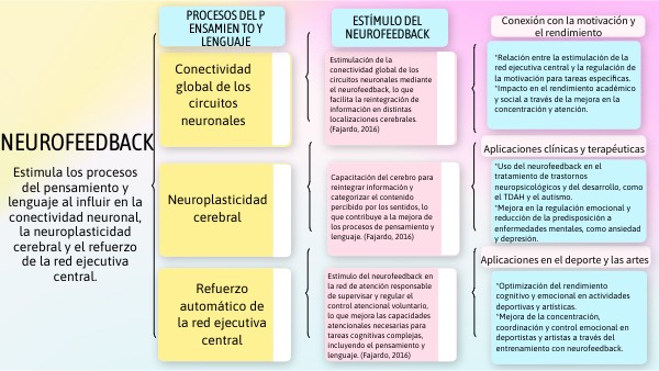Estímulo del neurofeedback en la red de atención responsable de supervisar y regular el control atencional voluntario, lo que mejora las capacidades atencionales necesarias para tareas cognitivas complejas, incluyendo el pensamiento y lenguaje. (Fajardo, 2016)