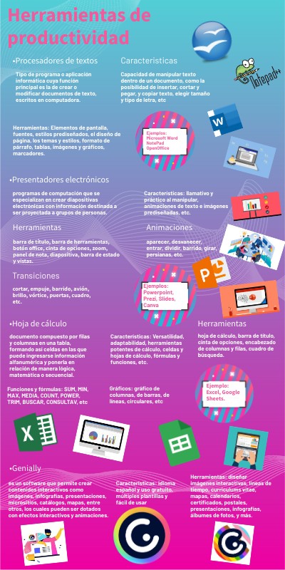 Herramientas: diseñar imágenes interactivas, líneas de tiempo, curriculums vitae, mapas, calendarios, certificados, postales, presentaciones, infografías, álbumes de fotos, y más.