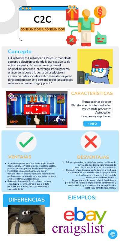 Transacciones directas: Implica transacciones comerciales directas entre consumidores individuales, sin la participación de empresas o intermediarios. Plataformas de intermediación: Se basa en plataformas en línea o físicas que facilitan las transacciones entre consumidores, como sitios web de subastas, marketplaces y grupos de compraventa en redes sociales. Variedad de productos: Permite la compra y venta de una amplia gama de productos usados, nuevos o artesanales, proporcionando oportunidades para la economía colaborativa y el reciclaje de bienes. Autogestión: Los consumidores son responsables de gestionar sus propias transacciones, incluyendo la fijación de precios, el envío y la comunicación directa entre comprador y vendedor. Confianza y reputación: La confianza y la reputación del vendedor son aspectos clave, ya que los consumidores confían en las calificaciones y reseñas de otros usuarios para tomar decisiones de compra seguras.