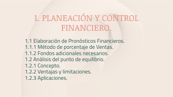 1.1 Elaboración de Pronósticos Financieros.1.1.1 Método de porcentaje de Ventas.1.1.2 Fondos adicionales necesarios.1.2 Análisis del punto de equilibrio.1.2.1 Concepto.1.2.2 Ventajas y limitaciones.1.2.3 Aplicaciones.