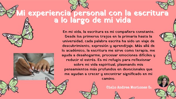 En mi vida, la escritura es mi compañera constante. Desde los primeros trazos en la primaria hasta la universidad, cada palabra escrita ha sido un viaje de descubrimiento, expresión y aprendizaje. Más allá de lo académico, la escritura me sirve como terapia, me ayuda a desahogarme, procesar emociones difíciles y reducir el estrés. Es mi refugio para reflexionar sobre mi vida espiritual, plasmando mis pensamientos más profundos en devocionales que me ayudan a crecer y encontrar significado en mi camino.