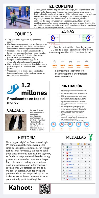 El curling es un deporte de precisión y de equipo, que se practica en una pista de hielo. Dos equipos de cuatro participantes compiten entre sí deslizando ocho piedras de granito de 20 kg cada una sobre un corredor de hielo de 45,5 metros (146 pies) de longitud y 4,75 metros (15 pies 7 pulgadas) de ancho. Una vez efectuado el lanzamiento, los otros miembros del equipo (sweepers o barredores), provistos de brooms (cepillos), acompañan a cada piedra actuando sobre la superficie de hielo para facilitar su avance o variar su dirección mediante el lijado o fricción de la superficie, pero siempre sin tocar la piedra