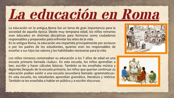 La educación en la antigua Roma fue un tema de gran importancia para la sociedad de aquella época. Desde muy temprana edad, los niños romanos eran educados en distintas disciplinas para formarse como ciudadanos responsables y preparados para enfrentar los retos de la vida.En la antigua Roma, la educación era impartida principalmente por esclavos o por los padres de los estudiantes, quienes eran los responsables de enseñar a sus hijos los valores y las habilidades necesarias para la vida. Los niños romanos comenzaban su educación a los 7 años de edad en una escuela primaria llamada «ludus». En esta escuela, los niños aprendían a leer, escribir y hacer cálculos básicos. También se les enseñaba música y deportes.Después de la escuela primaria, los niños que querían continuar su educación podían asistir a una escuela secundaria llamada «grammaticus». En esta escuela, los estudiantes aprendían gramática, literatura y retórica. También se les enseñaba a hablar en público y a escribir discursos.