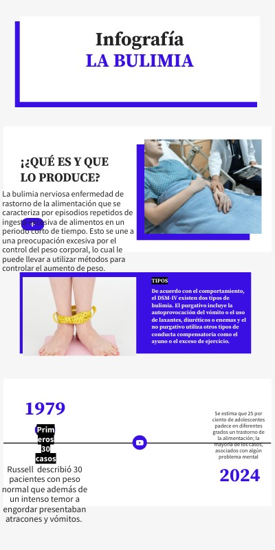 La bulimia nerviosa enfermedad de rastorno de la alimentación que se caracteriza por episodios repetidos de ingesta excesiva de alimentos en un periodo corto de tiempo. Esto se une a una preocupación excesiva por el control del peso corporal, lo cual le puede llevar a utilizar métodos para controlar el aumento de peso.