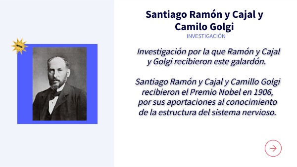 Investigación por la que Ramón y Cajal y Golgi recibieron este galardón. Santiago Ramón y Cajal y Camillo Golgi recibieron el Premio Nobel en 1906, por sus aportaciones al conocimiento de la estructura del sistema nervioso.
