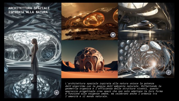 L'architettura spaziale ispirata alla natura unisce la potenza dell'algoritmo con la poesia dell'ambiente naturale. Riflettendo la geometria organica e l'efficienza delle strutture viventi, questo approccio progettuale crea spazi che non solo adattano la loro forma e funzione alle esigenze umane, ma celebrano anche l'armonia tra l'umanità e il mondo naturale.