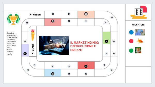 Scegliete una pedina, tirate i dadi e cercate di raggiungere l'obiettivo prima degli altri. Buona fortuna!