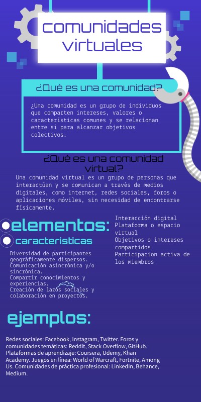 Redes sociales: Facebook, Instagram, Twitter. Foros y comunidades temáticas: Reddit, Stack Overflow, GitHub. Plataformas de aprendizaje: Coursera, Udemy, Khan Academy. Juegos en línea: World of Warcraft, Fortnite, Among Us. Comunidades de práctica profesional: LinkedIn, Behance, Medium.