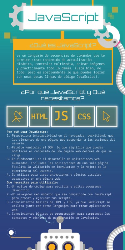 Por qué usar JavaScript: 1.-Proporciona interactividad en el navegador, permitiendo que los elementos de una página web respondan a las acciones del usuario. 2.-Permite manipular el DOM, lo que significa que puedes modificar el contenido de una página web después de que se carga. 3.-Es fundamental en el desarrollo de aplicaciones web avanzadas, incluidas las aplicaciones de una sola página. Facilita la validación de formularios y la mejora de la experiencia del usuario. 4.-Se utiliza para crear animaciones y efectos visuales atractivos en una página web. Qué necesitas para utilizarlo: 1.-Un editor de código para escribir y editar programas JavaScript. 2.-Un navegador web moderno que sea compatible con JavaScript para probar y ejecutar tus scripts. 3.-Conocimientos básicos de HTML y CSS, ya que JavaScript se utiliza junto con estos lenguajes para crear aplicaciones web. 4.-Conocimientos básicos de programación para comprender los conceptos y técnicas de programación en JavaScript.