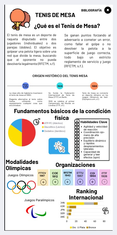 Objetivo Específico: Real Federación Española de Tenis de Mesa (RFETM). (s.f.). *Reglamento de juego*. Obtenido de https://www.rfetm.es/ Historia: International Table Tennis Federation (ITTF). (s.f.). *The history of table tennis*. ITTF Museum. Obtenido de https://www.ittf.com/museum/ Historia (JJOO) y Modalidades: Olympics.com. (s.f.). *Table Tennis*. Obtenido de https://olympics.com/en/sports/table-tennis/ Exigencias Físicas: Pradas, F., et al. (2018). Physical and physiological demands of table tennis. *Kinesiology, 50*(1), 58-67. Vías Energéticas: Zagatto, A. M., Morel, E. A., & Gobatto, C. A. (2010). Physiological responses and characteristics of table tennis. *Sports Medicine, 40*(9), 725-741. Modalidades Paralímpicas: Tenis de mesa | Paralímpicos. (s. f.). https://www.paralimpicos.es/deportes-paralimpicos/tenis-de-mesa Federaciones: Se han consultado los sitios web oficiales de la ITTF, ETTU, RFETM y FTTCV para verificar sus años de fundación y enlaces.
