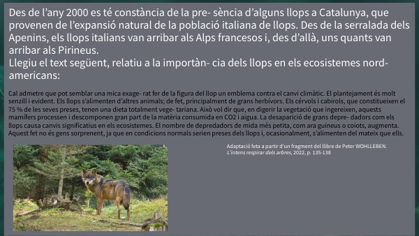Des de l’any 2000 es té constància de la pre- sència d’alguns llops a Catalunya, que provenen de l’expansió natural de la població italiana de llops. Des de la serralada dels Apenins, els llops italians van arribar als Alps francesos i, des d’allà, uns quants van arribar als Pirineus. Llegiu el text següent, relatiu a la importàn- cia dels llops en els ecosistemes nord-americans: