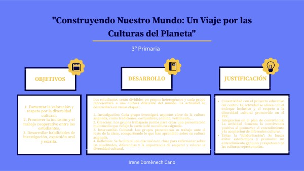 Los estudiantes serán divididos en grupos heterogéneos y cada grupo representará a una cultura diferente del mundo. La actividad se desarrollará en varias etapas:1. Investigación: Cada grupo investigará aspectos clave de la cultura asignada, como tradiciones, costumbres, comida, vestimenta,... 2. Creación: Los grupos trabajarán juntos para crear una presentación multimedia que refleje la esencia de su cultura asignada. 3. Intercambio Cultural: Los grupos presentarán su trabajo ante el resto de la clase, compartiendo lo que han aprendido sobre su cultura asignada. 4. Reflexión: Se facilitará una discusión en clase para reflexionar sobre las similitudes, diferencias y la importancia de respetar y valorar la diversidad cultural.