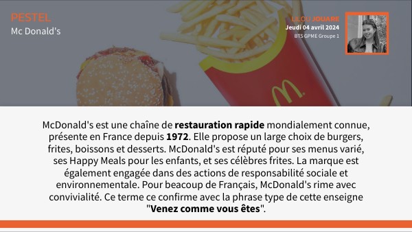 McDonald's est une chaîne de restauration rapide mondialement connue, présente en France depuis 1972. Elle propose un large choix de burgers, frites, boissons et desserts. McDonald's est réputé pour ses menus varié, ses Happy Meals pour les enfants, et ses célèbres frites. La marque est également engagée dans des actions de responsabilité sociale et environnementale. Pour beacoup de Français, McDonald's rime avec convivialité. Ce terme ce confirme avec la phrase type de cette enseigne "Venez comme vous êtes".
