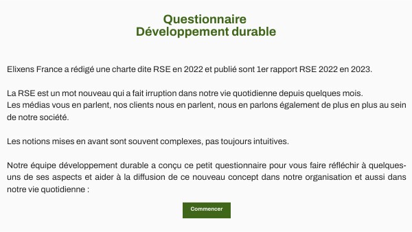 Elixens France a rédigé une charte dite RSE en 2022 et publié sont 1er rapport RSE 2022 en 2023. La RSE est un mot nouveau qui a fait irruption dans notre vie quotidienne depuis quelques mois. Les médias vous en parlent, nos clients nous en parlent, nous en parlons également de plus en plus au sein de notre société. Les notions mises en avant sont souvent complexes, pas toujours intuitives. Notre équipe développement durable a conçu ce petit questionnaire pour vous faire réfléchir à quelques- uns de ses aspects et aider à la diffusion de ce nouveau concept dans notre organisation et aussi dans notre vie quotidienne :