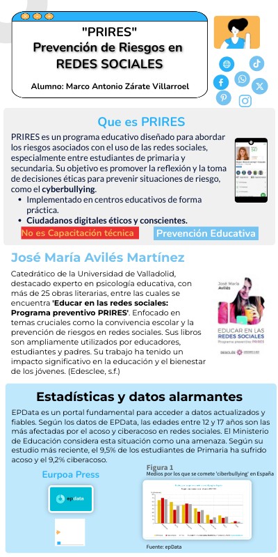 PRIRES es un programa educativo diseñado para abordar los riesgos asociados con el uso de las redes sociales, especialmente entre estudiantes de primaria y secundaria. Su objetivo es promover la reflexión y la toma de decisiones éticas para prevenir situaciones de riesgo, como el cyberbullying.