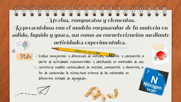 Mezlas, compuestos y elementos. Representdaos con el modelo corpuscular de la materia en sólido, líquido y gases, así como su caracterización mediante actividades experimentales.