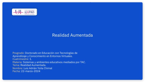 Posgrado: Doctorado en Educación con Tecnologías de Aprendizaje y Conocimiento en Entornos Virtuales. Cuatrimestre: 1. Materia: Sistemas y ambientes educativos mediados por TAC. Tema: Realidad Aumentada. Nombre: Luis Adrián Ysita Chimal Fecha: 22-marzo-2024