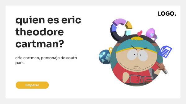 eric theodore cartman, mas conocido como cartman, es un estudiante americano de cuarto grado, tiene 10 años, los ojos marrones pero un oculista le fastidio y ahora tiene un ojo marron y el otro azul, el pelo lo tiene como sale en el gif, el p3n3 le mide 1.2 pulgadas JAJAJAJA. fue blaintologo y judio, pero actualmente es catolico romano. su madre es liane cartman, su padre jack tenorman (lo mató...), su hermanastro scott tenorman, su abuela mabel cartman, su abuelo harold cartman, su tia lisa cartman, su tio howard cartman, su prima alexandra cartman, y sus primos elvin y fred cartman.