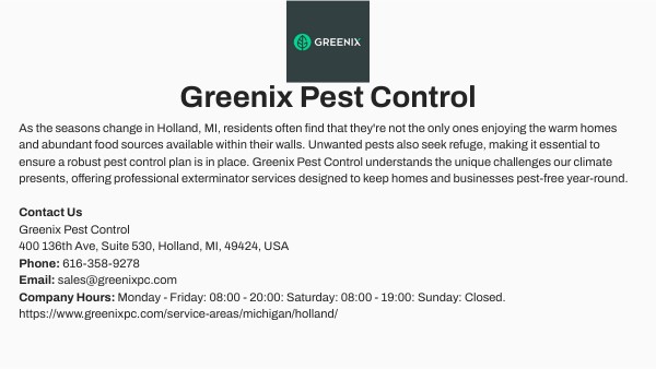 As the seasons change in Holland, MI, residents often find that they're not the only ones enjoying the warm homes and abundant food sources available within their walls. Unwanted pests also seek refuge, making it essential to ensure a robust pest control plan is in place. Greenix Pest Control understands the unique challenges our climate presents, offering professional exterminator services designed to keep homes and businesses pest-free year-round. Contact Us