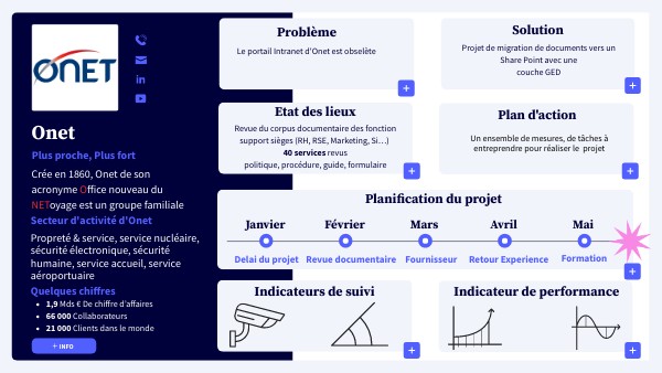 Objectif qualité : pouvoir rechercher les documents plus facilement avec des métadonnées, une codification des documents, un circuit de validation des documents, un système d’archivage des documents, un versionning des documents et pour finir la mise en place en interne chez Onet de formations pour l’utilisations du portail.Objectif coût : le budget prévisionnel est de 150 000 euros maximum. Objectif délai : le projet à commencé à se former en janvier 2023 et doit se terminer au deuxième trimestre 2024.