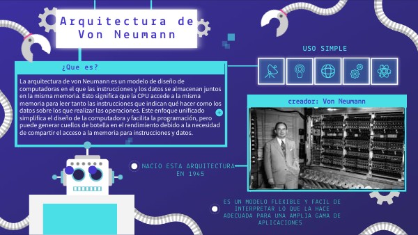 La arquitectura de von Neumann es un modelo de diseño de computadoras en el que las instrucciones y los datos se almacenan juntos en la misma memoria. Esto significa que la CPU accede a la misma memoria para leer tanto las instrucciones que indican qué hacer como los datos sobre los que realizar las operaciones. Este enfoque unificado simplifica el diseño de la computadora y facilita la programación, pero puede generar cuellos de botella en el rendimiento debido a la necesidad de compartir el acceso a la memoria para instrucciones y datos.