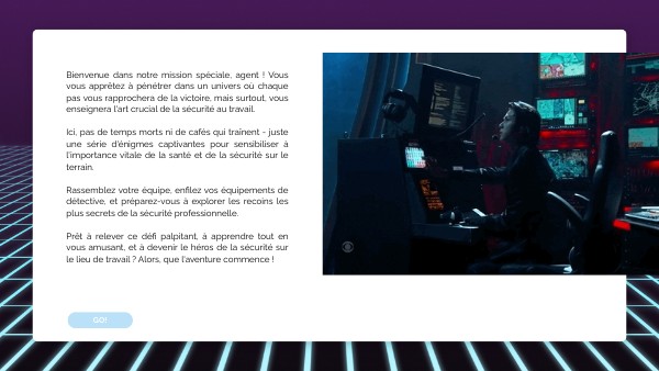 Bienvenue dans notre mission spéciale, agent ! Vous vous apprêtez à pénétrer dans un univers où chaque pas vous rapprochera de la victoire, mais surtout, vous enseignera l'art crucial de la sécurité au travail. Ici, pas de temps morts ni de cafés qui traînent - juste une série d'énigmes captivantes pour sensibiliser à l'importance vitale de la santé et de la sécurité sur le terrain. Rassemblez votre équipe, enfilez vos équipements de détective, et préparez-vous à explorer les recoins les plus secrets de la sécurité professionnelle. Prêt à relever ce défi palpitant, à apprendre tout en vous amusant, et à devenir le héros de la sécurité sur le lieu de travail ? Alors, que l'aventure commence !