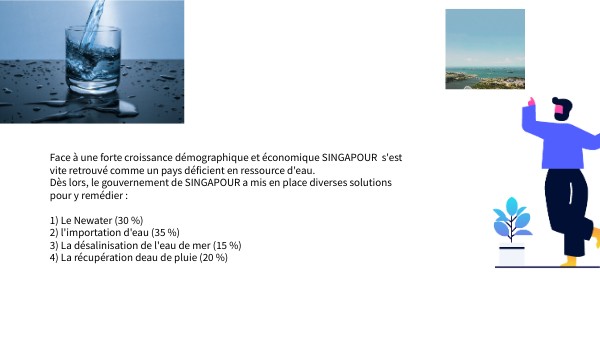 Face à une forte croissance démographique et économique SINGAPOUR s'est vite retrouvé comme un pays déficient en ressource d'eau. Dès lors, le gouvernement de SINGAPOUR a mis en place diverses solutions pour y remédier : 1) Le Newater (30 %) 2) l'importation d'eau (35 %) 3) La désalinisation de l'eau de mer (15 %) 4) La récupération deau de pluie (20 %)