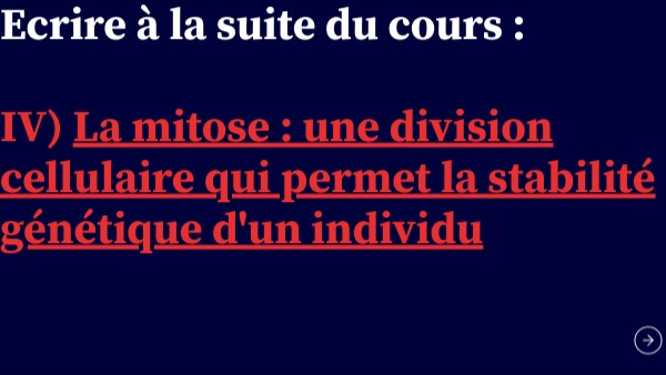 Ecrire à la suite du cours : IV) La mitose : une division cellulaire qui permet la stabilité génétique d'un individu