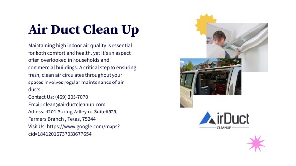Maintaining high indoor air quality is essential for both comfort and health, yet it's an aspect often overlooked in households and commercial buildings. A critical step to ensuring fresh, clean air circulates throughout your spaces involves regular maintenance of air ducts.Contact Us: (469) 205-7070Email: clean@airductcleanup.comAdress: 4201 Spring Valley rd Suite#575, Farmers Branch , Texas, 75244 Visit Us: https://www.google.com/maps?cid=18412016737033677654