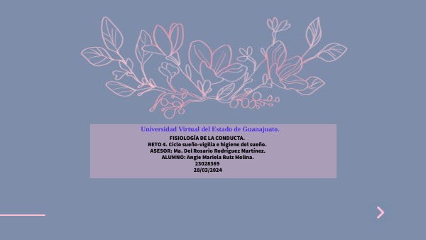FISIOLOGÍA DE LA CONDUCTA. RETO 4. Ciclo sueño-vigilia e higiene del sueño. ASESOR: Ma. Del Rosario Rodríguez Martínez. ALUMNO: Angie Mariela Ruiz Molina. 23028369 28/03/2024