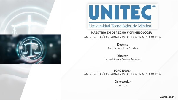 ANTROPOLOGÍA CRIMINAL Y PRECEPTOS CRIMINOLÓGICOS Docente Rosalba Apolinar Valdez Discente Ismael Alexis Segura Montes FORO NÚM. 1 ANTROPOLOGÍA CRIMINAL Y PRECEPTOS CRIMINOLÓGICOS Ciclo escolar 24 - 02