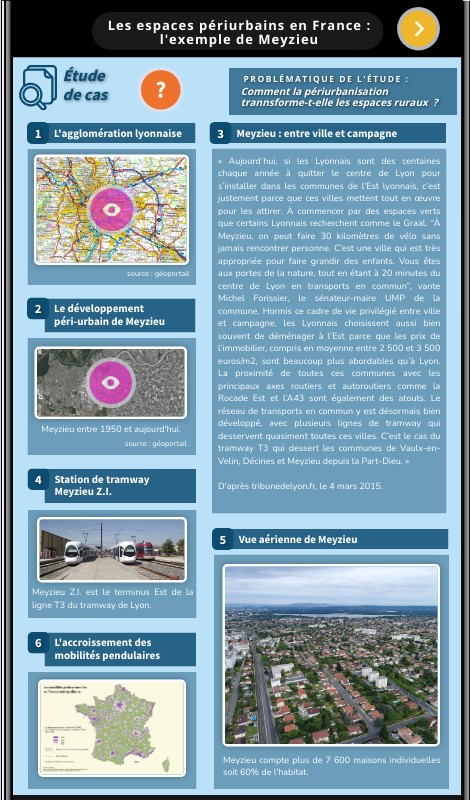 1. Localisez précisément Meyzieu.2. Décrivez l'évolution de la commune de Meyzieu.3. Montrez que Meyzieu est devenue un espace rural multifonctionnel. 4. Identifiez plusieurs raisons expliquant l'attractivité de Meyzieu. 5. A l'aide des documents et de vos connaissances personnelles, rédigez une réponse argumentée à la question suivante : la mobilité, une question importante pour les périurbains ?