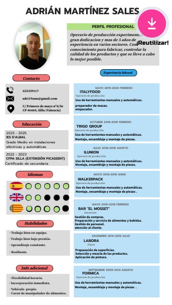 Operari de producció experimentat, amb gran dedicació i mes de 5 anys d'experiència en diversos sectors. Amb coneixement per a fabricar, controlar la qualitat dels productes i que es duga a terme amb lo millor possible.