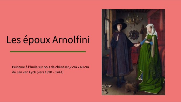 Ce tableau est l'un des plus connus au monde, du fait du mystère qui l'entoure. En effet, le peintre a mis tellement de détail dans son tableau qu'aujourd'hui encore il existe des interprétations différentes. Grâce à une nouvelle technique de peinture consistant à peindre une bourgeoisie naissante, ici la famille Arnolfini. Alors qu'au Moyen-Age, seul le sacré était peint, on commence ici au XVe siècle à glisser vers l'art profane dont l'Homme peut être le sujet. Se lance alors un mouvement artistique des portraits au coeur du quotidien.