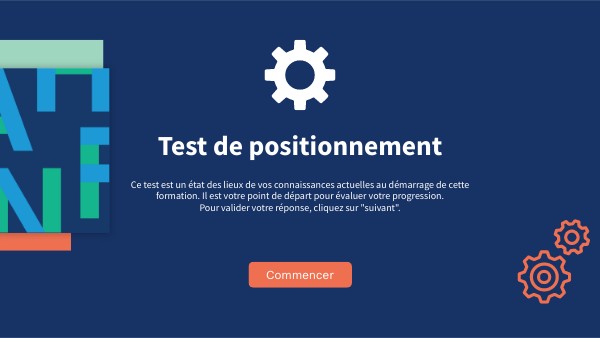 Ce test est un état des lieux de vos connaissances actuelles au démarrage de cette formation. Il est votre point de départ pour évaluer votre progression.Pour valider votre réponse, cliquez sur "suivant".