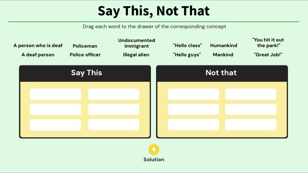 A person who is deaf; police officer; undocumented immigrant; "hello class"; humankind; "great job!"
