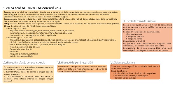 Consciència: coneixènça immediata i directa que la persona té de la seva pròpia existpencia, condició, sensacions, actes...Alerta/vigília: situació d'estar despert i reactiu als estímuls externs. SARA (sistema activador reticular ascendent). Confusió: desorientació temporo-espacial mantenint estat de vigília. Somnolència: Estat de reducció de l'activitat mental i física (entre la son i la vigília). Sense pèrdua total de la consciència. Sense estímuls externs és incapaç de antenir estat de vigília. Estupor: estat d'inconsiència total o parcial, sense moviments i sense rxó a estímuls. Pot haver rxó a estímuls molt potents. COMA: disminució total del nivell de consciència. Tipus: - Neurològic --> c:SNC - Supratentorials: hemorràgies, hematomes, infarts, tumors, abscesos - Intratentorial: hemorràgies, hematomes, infarts, tumors, abscesos - Lesions difuses: meningitis, encefalitis, epilèpsia - No neurològic --> c: no SNC - Metabòlic: hipoglucèmia, cetoacidosis diabètica, coma hiperosmolar, encefalopatia hepàtica, hiper/hiponatrèmia - Hipòxic: insuficiència cardiaca, insuficiència respiratòria, anèmia severa... - Tòxic: intoxicació per metalls, CO, alcohol, fàrmacs, drogues... - Físic: hiponatrèmia, cop de calor - Carencials: vitamina B1 - Infecciós - Psiquiàtric: histèria, catatònia - Induït: ttm farmacològic