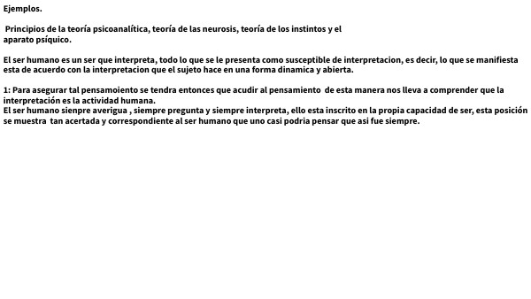Ejemplos. Principios de la teoría psicoanalítica, teoría de las neurosis, teoría de los instintos y el aparato psíquico. El ser humano es un ser que interpreta, todo lo que se le presenta como susceptible de interpretacion, es decir, lo que se manifiesta esta de acuerdo con la interpretacion que el sujeto hace en una forma dinamica y abierta. 1: Para asegurar tal pensamoiento se tendra entonces que acudir al pensamiento de esta manera nos lleva a comprender que la interpretación es la actividad humana. El ser humano sienpre averigua , siempre pregunta y siempre interpreta, ello esta inscrito en la propia capacidad de ser, esta posición se muestra tan acertada y correspondiente al ser humano que uno casi podria pensar que asi fue siempre.