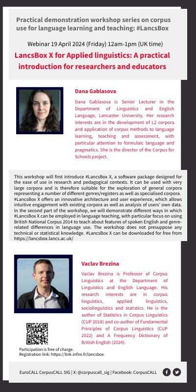 This workshop will first introduce #LancsBox X, a software package designed for the ease of use in research and pedagogical contexts. It can be used with very large corpora and is therefore suitable for the exploration of general corpora representing a number of different genres/registers as well as specialised corpora. #LancsBox X offers an innovative architecture and user experience, which allows intuitive engagement with existing corpora as well as analysis of users’ own data. In the second part of the workshop, we will demonstrate different ways in which #LancsBox X can be employed in language teaching, with particular focus on using British National Corpus 2014 to teach about features of spoken English and genre-related differences in language use. The workshop does not presuppose any technical or statistical knowledge. #LancsBox X can be downloaded for free from https://lancsbox.lancs.ac.uk/