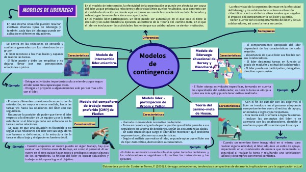 - Presenta diferentes conexiones de acuerdo con la orientación, en mayor o menor medida, hacia las tareas y/o hacia las relaciones del líder con sus seguidores.- Reconocer la posición de poder que tiene el líder respecto a la dirección de un equipo y por lo tanto, establecer si el liderazgo debe ser enfocado en la tarea o en las relaciones.- Se basa en que una situación es favorable o no según si las relaciones del líder con sus seguidores son buenas o deficientes, si la estructura de la tarea es alta o baja y si el poder es fuerte o débil.