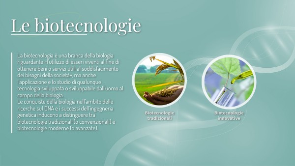 La biotecnologia è una branca della biologia riguardante «l'utilizzo di esseri viventi al fine di ottenere beni o servizi utili al soddisfacimento dei bisogni della società», ma anche l'applicazione e lo studio di qualunque tecnologia sviluppata o sviluppabile dall'uomo al campo della biologia.Le conquiste della biologia nell’ambito delle ricerche sul DNA e i successi dell’ingegneria genetica inducono a distinguere tra biotecnologie tradizionali (o convenzionali) e biotecnologie moderne (o avanzate).