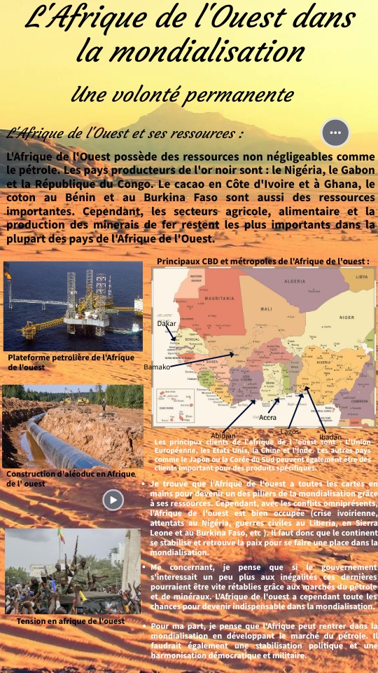 - Je trouve que l'Afrique de l'ouest a toutes les cartes en mains pour devenir un des piliers de la mondialisation grâce à ses ressources. Cependant, avec les conflits omniprésents, l'Afrique de l'ouest est bien occupée (crise ivoirienne, attentats au Nigéria, guerres civiles au Liberia, en Sierra Leone et au Burkina Faso, etc ). Il faut donc que le continent se stabilise et retrouve la paix pour se faire une place dans la mondialisation.
