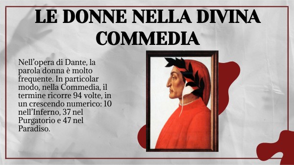 Nell’opera di Dante, la parola donna è molto frequente. In particolar modo, nella Commedia, il termine ricorre 94 volte, in un crescendo numerico: 10 nell’Inferno, 37 nel Purgatorio e 47 nel Paradiso.