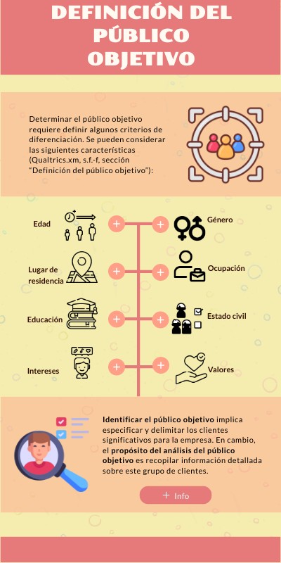 Determinar el público objetivo requiere definir algunos criterios de diferenciación. Se pueden considerar las siguientes características (Qualtrics.xm, s.f.-f, sección “Definición del público objetivo”):