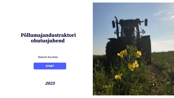 Põllumajandustraktori ohutusjuhendamise digikeskkonna läbimise maht on 1,5 tundi, millele lisaks on vajalik läbida vähemalt 30 minutiline praktilne juhendamine. Digikeskkonnas on testid, mille lahendamine eeldab teoreetilise osa eelnevat läbi töötamist. Iga mooduli lõpetuseks on test Google vormi keskkonnas ning test avaneb uue vahelehena, mille võib sulgeda pärast testi sooritamist. Teoreetiline materjal toetab kokkuvõtva testi sooritamist, mis teostatakse digikeskkonna läbimisel viimasena. Vastamiseks on ainult üks katse ning maksimum punkte on võimalik saada kokku 27 punkti. Kokkuvõtva testi tulemuseks on vajalik koguda 80% õigeid vastuseid, et ohutusjuhendamine lugeda sooritatuks. Kogu digikeskkonnaga seotud teoreetiline informatsioon on leitav John Deere, Massey Ferguson ja New Hollandi kasutusjuhenditest, mis on aluseks võetud digikeskkonna sisu loomisel. Viited leitavad allikaloendist. Loodan, et digikeskkonna sisu on meelepärane ja jääte rahule. Omandate ohutusalaseid teadmisi ning läbite loodud sisu maksimaalsele tulemusele. Edu! Maksim Kandala Maksten.ou@gmail.com Maksten.ee