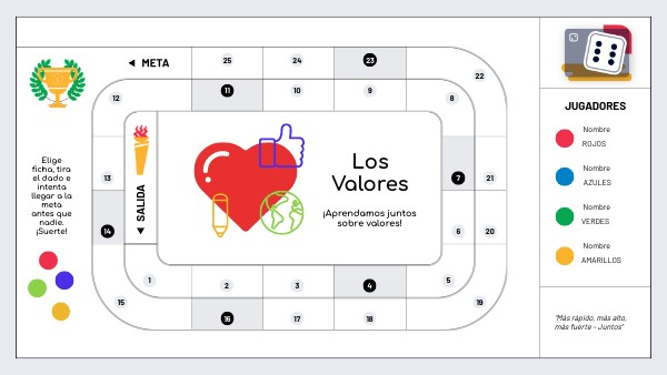 Elige ficha, tira el dado e intenta llegar a la meta antes que nadie. ¡Suerte!